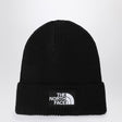 The North Face hat made of black recycled fabric, featuring a cuff with a patch with logo lettering on the front.