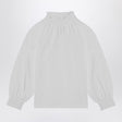 White cotton blouse from Douuod featuring long sleeves with elasticated cuff, elasticated high collar, back lettering logo and straight hem.