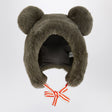 Mini Rodini fluffy hat for girls made from recycled polyester, with two playful pom poms on top and a red-and-white lace tie under the chin for an adjustable fit.