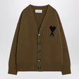 Bronze virgin wool cardigan from Ami Paris featuring long sleeves, a V-neck, ribbed edges, a front button placket and a contrasting logo inlay on the chest. Size and Fit - Model wears size S Model measurements: Height: 178 cm Chest: 89 cm Waist: 62 cm Hips: 88 cm