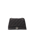 Crush Medium Denim Shoulder Bag. In black denim, iconic and slightly curved structured shape, chain shoulder strap and metal logo on the front. Covered snap button closure, two internal compartments and zip pocket