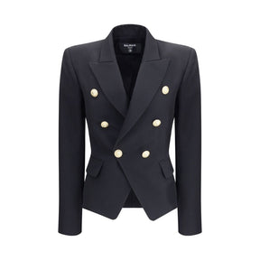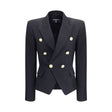Balmain’s double-breasted Blazer is a sartorial statement piece, embellished with embossed buttons that recall the house’s iconic aesthetic. The crop design enhances the figure, while the wide peaked lapels lend a touch of decisive elegance. Completing the look are two welt flap pockets for the perfect balance of style and functionality.