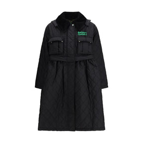 The quilted hooded Coat by Barbour x GANNI features diamond quilting and paneled construction for a functional yet contemporary look. The ribbed collar and zip-and-snap closure offer practicality, while the hood and two upper front pockets enhance comfort. A rubber collaboration logo patch accents the upper left side. An additional mid-section zipper allows the lower part of the coat to be detached, converting it into a shorter, more versatile silhouette.