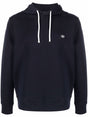Navy cotton-blend long-sleeved logo patch hoodie from EMPORIO ARMANI featuring ribbed detailing, logo patch at the chest, drawstring hood and long sleeves. Logo cotton hoodie Size and Fit - This piece fits true to size. We recommend you get your regular size. Model is 1,84m / 6ft 1in wearing size M
