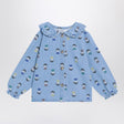 Bobo Choses shirt in light blue cotton blend denim with colourful all-over print, featuring front buttoning, long sleeves with elasticated cuffs, and a collar with ruffle trim.