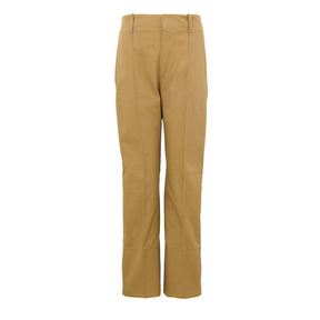 High waist, front fastening with covered hooks, two side pockets, one back pocket closed with covered zip, central seam on the leg, on the bottom openable button.