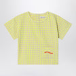Bobo Choses round-neck blouse in cotton blend with yellow Vichy pattern, featuring short sleeves, an applied pocket on the front with contrasting logo lettering embroidery, and a back closure with buttons.