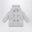 Grey fleece double-breasted hooded jacket from Il Gufo featuring long sleeves, a front button placket and two patch pockets on the front.