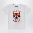 Kenzo white cotton crew neck T-shirt, featuring short sleeves, buttons on the shoulders, and a contrasting logo print on the front.