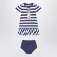 Set by  Polo Ralph Lauren in cotton, consisting of a crew neck dress in white and navy blue stripes with short sleeves, buttons on the back, Polo Bear print on the front, and navy blue shorts with elasticated edges.