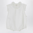 Teddy & Minou white cotton romper, featuring a round neck with ruffles, short sleeves, snap buttons at the crotch, and a logo tag on the side.