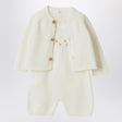 Complete with Teddy & Minou in white organic cotton yarn, consisting of a short-sleeved bodysuit with snap buttons on the back and bottom, a short romper with buttons, a cat face embroidery on the front and ribbed finishes, and a long-sleeved cardigan with front buttoning.