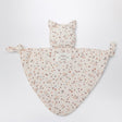 Teddy & Minou doudou in cream cotton gauze with all-over pink floral print, featuring triangular design with knotted edges, kitten head, and logo patch.
