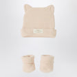 Teddy & Minou set in light pink viscose blend waffle texture, consisting of a beanie with cat ears and cuff with logo patch, and sock-style booties.
