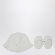 Set of two pieces of Teddy & Minou in white cotton gauze, consisting of a hat with a ruffled brim and logo patch and booties with elastic finish and bunny ears.