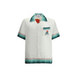 The Montagne Ondulée Shirt is an iconic short-sleeved garment made of fine printed silk twill. The all-over print, inspired by traditional Japanese iconography, interprets a refined, contemporary aesthetic with essential lines and bold colors. The Cuban collar and front closure with concealed buttons lend casual elegance, while corozo buttons with CC woven logo add a touch of exclusivity. Memphis wave-patterned piping on the collar, cuffs and hem complete the design, lending a distinctive and sophisticated graphic accent.