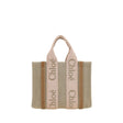 Chloé’s Woody Handbag is an elegant and practical accessory made of linen and detailed with contrasting leather. The concealed button top closure maintains a clean design, while the double flat handles and extension on the leather side panels add sophistication. The removable and adjustable leather shoulder strap also allows it to be carried on the shoulder, offering versatility. Inside, a welt pocket keeps smaller items tidy, while the brand’s iconic signature is affixed to the side panels, lending a distinctive touch.