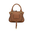 Calfskin Marcie Handbag by Chloé, double rigid leather top handle, removable and adjustable leather shoulder strap, top zipper closure, front flap with iconic leather tassel detail, iconic brand monogram press-stamped on front, open front pocket hidden by flap, single interior compartment.