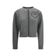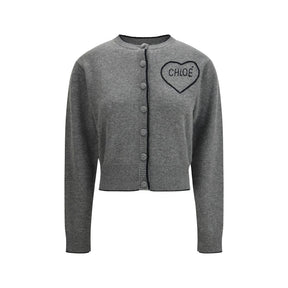 The fitted logo Cardigan by Chloé is crafted from ribbed wool and cashmere knit, featuring a refined crew neck and contrasting trims that define its silhouette. The front fastening is detailed with fabric-covered buttons, while the embroidered Chloé logo on the chest—framed by a heart—adds a distinctive and romantic touch to the design.