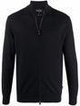 navy-blue virgin wool fine knit high neck front zip fastening long sleeves Wool zipped cardigan