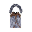 The Mon Tresor Bucket Bag by Fendi is made of denim-effect FF jacquard in shades of blue, with brown calfskin details that enhance its elegance. The interior is lined and enriched with gold-finish metal accessories. The handle, decorated with small fringes, and the adjustable and removable leather shoulder strap allow it to be worn by hand, on the shoulder or cross-body, for a versatile and refined style.