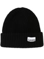 black wool blend ribbed knit logo patch to the front turn-up brim This item is made from at least 50% recycled or upcycled materials. For recycled synthetic clothing products, we highly recommend using a microfibre-catching washing bag to ensure that no microplastics that can pollute water are released in the process. Learn more about what makes a product Conscious on our Conscious Criteria page. Wool beanie Size and Fit - CIRCUMFERENCE: 56.0 Centimetres.
