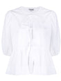 Front bow closure, crewneck, short puff sleeves and flounces on the bottom hemline. Cotton peplum top