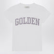 Golden Goose Deluxe Brand white cotton T-shirt, featuring short sleeves, ribbed crew neck, and front logo lettering print with pink glitter.