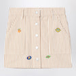 Kenzo mini skirt in cotton with white and sand-coloured stripes, featuring buttons on the front, belt loops at the waist, two side welt pockets, and colourful patches all over.
