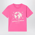 Pink organic cotton T-shirt by Mini Rodini, featuring short sleeves, ribbed crew neck and contrasting logo print on the front.