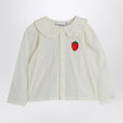 White organic cotton Mini Rodini blouse, featuring long sleeves, front buttoning, embroidered strawberry on the chest, and ruffled collar.