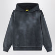 Dark gray washed-effect cotton hooded sweatshirt by Off-White featuring relaxed fit, ribbed trims, front kangaroo pocket, long sleeves, and contrasting logo lettering on the chest.