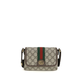 The Ophidia Mini Shoulder Bag by Gucci combines iconic details and compact size in a timeless design. Made of fabric lined with beige and dark brown GG monogram, it features tone-on-tone leather trim and gold-tone details. The brown moiré-lined interior includes two handy card slots. A magnetic snap-button closure and adjustable fabric shoulder strap complete the design, which is embellished with a double G and distinctive Web ribbon.