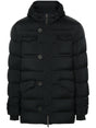 black goose down padded design drawstring hood long sleeves with ribbed cuffs two chest flap pockets two front flap pockets straight hem multiple internal slip pockets full lining front button and zip fastening L'Eskimo nylon down jacket