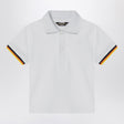 K-Way white cotton polo, characterized by short sleeves with contrasting striped edges, buttons on the front, and a logo patch on the chest.