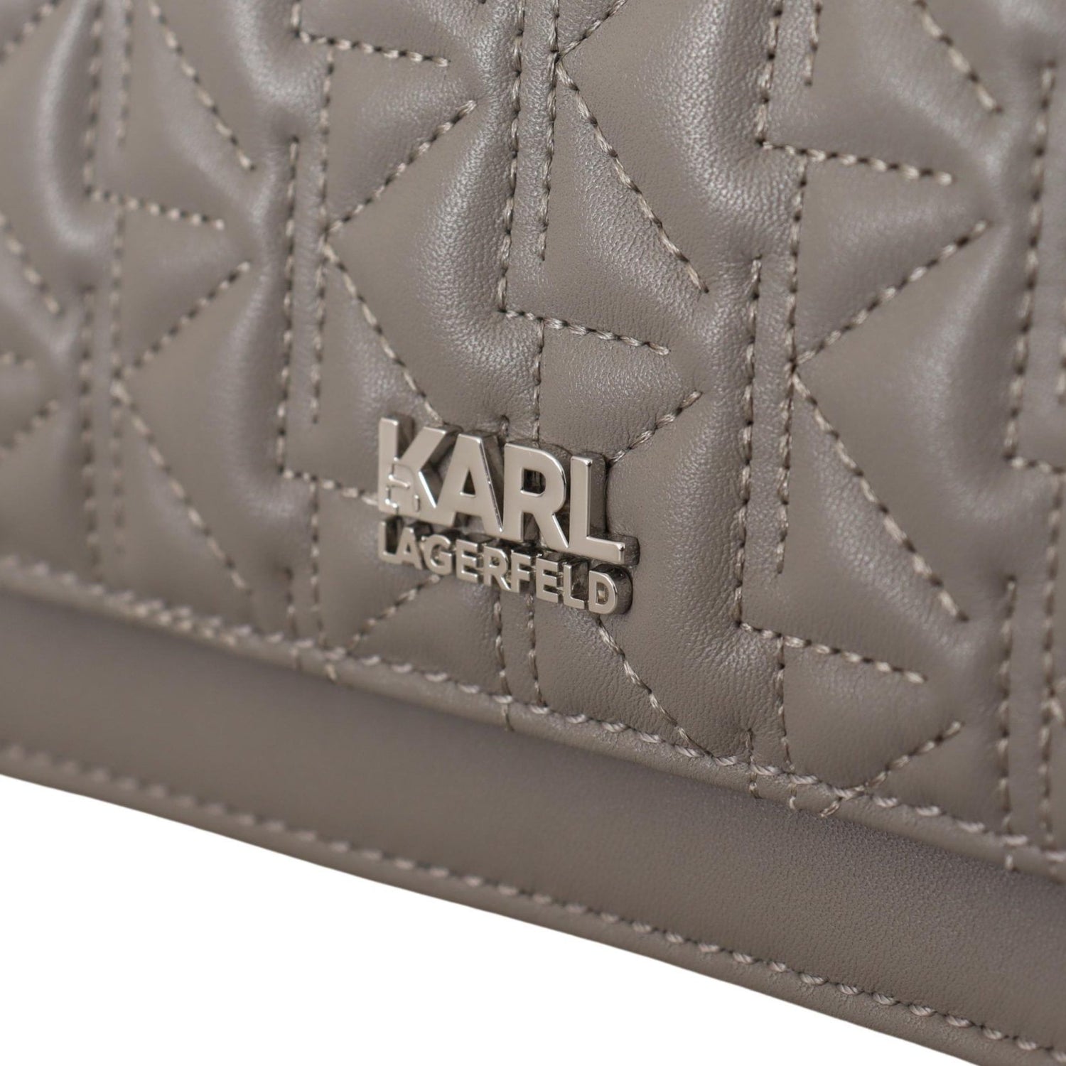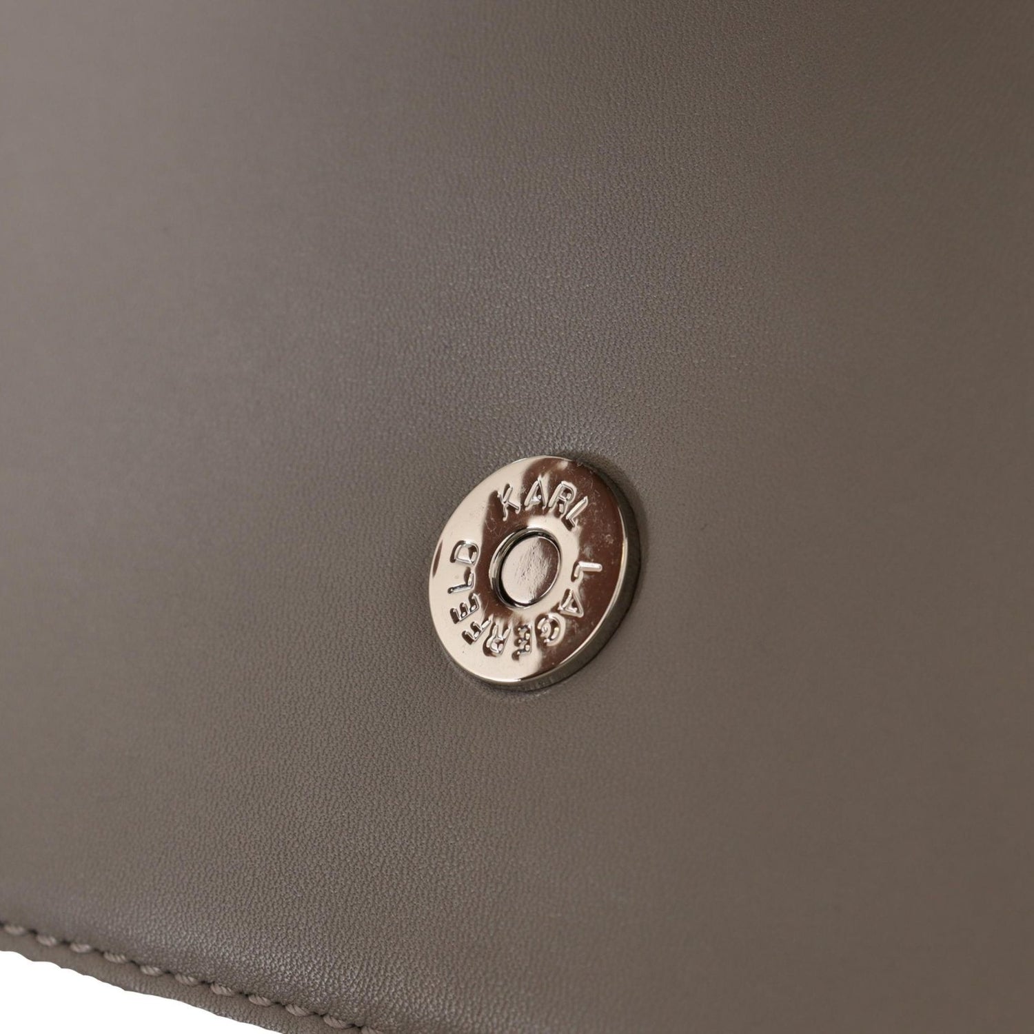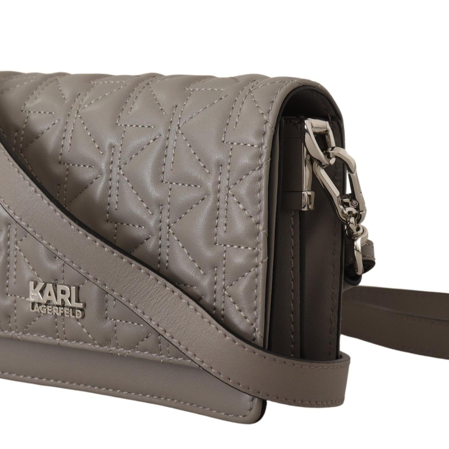 Details: Flap snap closure, Karl logo, 2 main compartments, interior zip compartment, a silver-tone hardware with removable and adjustable shoulder strap for shoulder or crossbody wear.