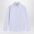 Golden Goose Deluxe Brand white cotton shirt with blue stripes, featuring long sleeves with buttoned cuffs, a patch pocket on the chest, embroidered logo lettering, and front buttoning.