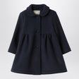 Blue wool blend couture fleece single-breasted coat from Il Gufo featuring a round collar, long sleeves, a front button placket and two side welt pockets.