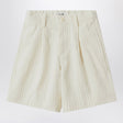 Bermuda by Il Gufo in white cotton blend with pinstripe pattern, featuring a front closure with zip and button, adjustable elastic waistband, belt loops, two side welt pockets, and one welt pocket with button at the back.