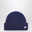 K-Way hat in a cobalt blue mélange wool and cotton blend, characterized by a ribbed design and a cuff with a silicone logo patch on the front.