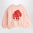 Mini Rodini crew neck sweatshirt in organic cotton fleece pink, featuring long sleeves, ribbed edges, and a contrasting logo lettering and mammoth print on the front.