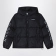 Dark gray nylon Ripstop hooded puffer jacket by Off-White, featuring front zip closure, contrasting logo lettering print on the front, long sleeves with elastic cuffs, and two side pockets.