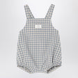 Teddy & Minou checkered cotton overalls, featuring an applied pocket on the front with a logo patch, crossed straps on the back, elasticated edges, snap buttons at the crotch, and a white short-sleeved t-shirt.