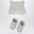 Teddy & Minou set in pumice-coloured viscose blend waffle texture, consisting of a beanie with cat ears and cuff with logo patch, and sock-style booties.