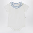 Teddy & Minou''s white cotton onesie, characterized by short sleeves, snap buttons on the crotch, a light blue ruffled collar with Liberty style print, and a closure at the back with buttons.