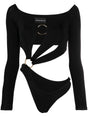 off-shoulder cut-out bodysuit from Louisa Ballou featuring black, stretch-jersey, ring hardware detailing, cut-out detailing, off-shoulder, long sleeves and backless. Just a reminder that this piece must be tried on over your own garments.. Long sleeve cut-out bodysuit Size and Fit - This piece fits true to size. We recommend you get your regular size. Model is 1,75m / 5ft 8in wearing size S