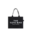 The cotton The Large Tote Handbag by Marc Jacobs, two rigid tubular top handles, top zipper closure, single interior pocket, adjustable and removable flat shoulder strap, contrasting jacquard print iconic brand monogram on front, contrasting patch with iconic brand monogram applied on back.