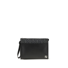 Fendi’s Pouch combines elegance and practicality with its fine workmanship in smooth leather and black FF canvas. Enriched by the application of the FF metal logo, it features a zipper closure and palladium-finish metal hardware. The removable cuff handle adds versatility, making this pouch a sophisticated and functional accessory.