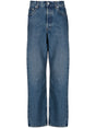 high-rise loose-fit jeans from AMBUSH featuring ocean blue, cotton, dark wash, logo patch to the rear, belt loops, high-waisted, wide leg, front button fastening and classic five pockets. Regular fit denim jeans Size and Fit - This piece fits true to size. We recommend you get your regular size. Model is 1,84m / 6ft 1in wearing size 32 (WAIST CM)