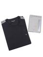 Black top, short sleeves, straight hem, crew neck, logo on the chest and shoulders.